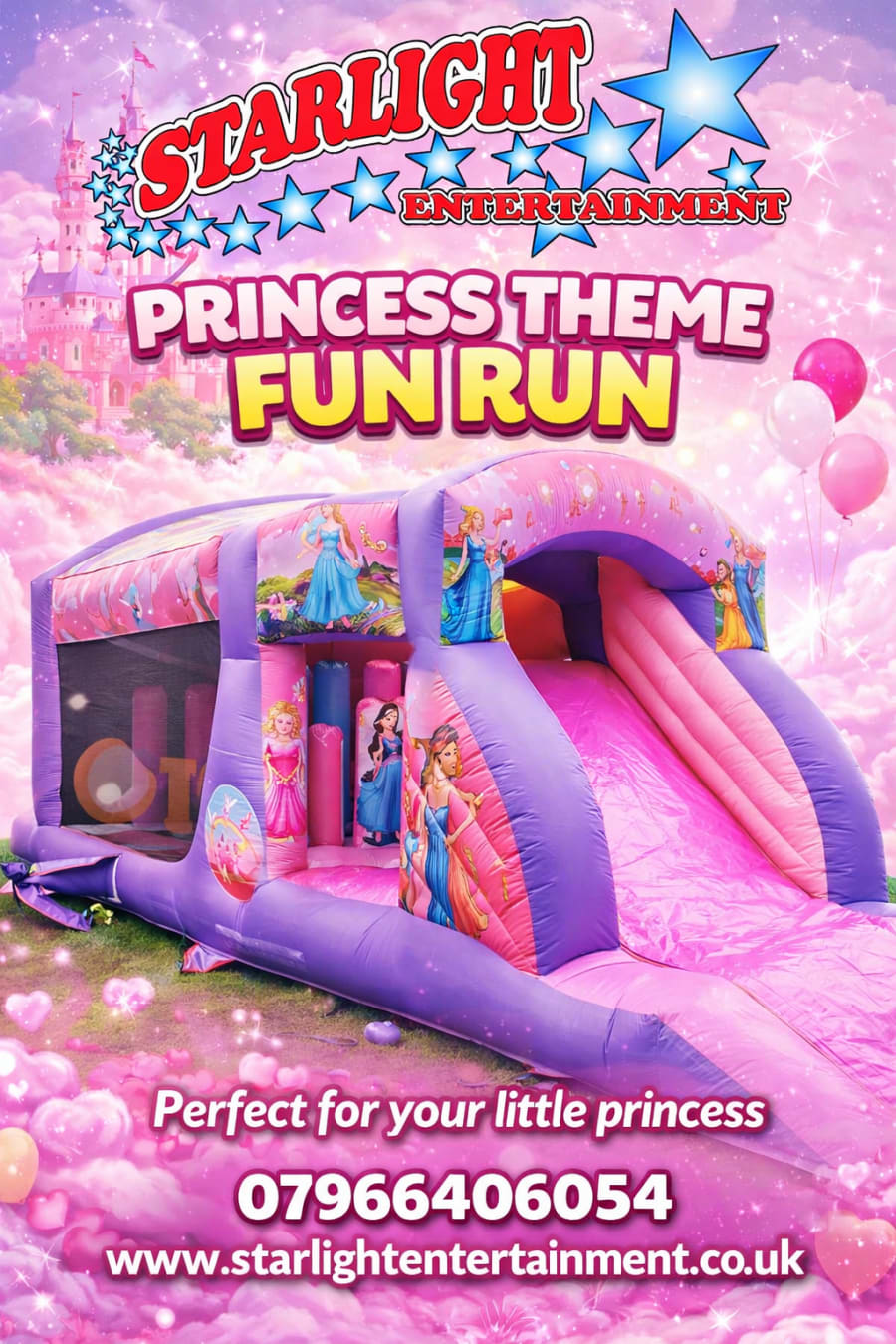 Bring fairy-tale fun to your event with the Princess Fun Run. Fast setup. Bright colours. Safe design. Perfect for birthdays, school fairs, and family gatherings in Bideford, Barnstaple, Torrington, Ilfracombe, Bude, and surrounding areas. This attraction combines a playful slide with stunning biff & bash amazing artwork to delight children and parents alike.